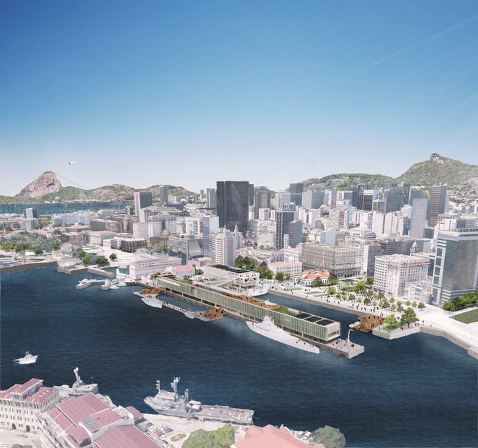 O novo Museu Marítimo do Brasil (MMB) foi concebido como um “sistema binário”, dois edifícios (0 e 1) complementares programática e funcionalmente. A origem etimológica do termo zero encontra-se numa palavra do árabe clássico que se pode traduzir como “vazio”. Se na matemática o vazio (zero) é nulo, na arquitetura, é no vazio que acontecem os encontros, os eventos e a vida. O Edifício de Acolhimento junto a Orla concentra as atividades coletivas, de serviço e administrativas. Faz a mediação com a cidade a partir de um piso contínuo e convidativo, criando uma cota pública que se estenderá até o Píer. Entre os edifícios dois elementos distintos conquistam o “mar interior” que até agora era apenas das embarcações. O Flutuante do Largo, esgarça a fina tripa que conectava as áreas A e B. Assim como um largo urbano, funcionará com espaço de encontro e permanência. Já o Edifício que se eleva sobre o Píer, será construído apoiando-se nas novas fundações recentemente executadas. Ele libera o Píer para multiplicar a sua capacidade de atracamento, só que agora poderá ser feito debaixo de uma generosa cobertura que protege do sol e da chuva. O grande “contenedor” expositivo que flutua acima disso se organiza em dois volumes internos para atender a Exposição Temporária de um lado e a Exposição de Longa Duração do outro. Entre elas há uma conexão infra estrutural, composta por uma passarela e uma rampa, que associam diversas possibilidades de percursos e conexões. Na cobertura desta “nau” é criado um convés de lazer e ócio para apreciar a Baía de Guanabara.