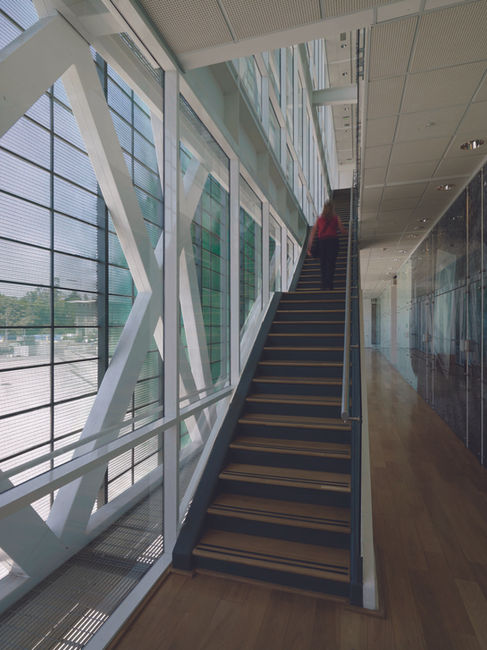Corridas, nas duas laterais da barra, a circulação, sanitários, apoios, iluminados desde o céu. A luz desce zenitalmente, e penetra em toda a barra através dos vidros laterais que divisam a circulação e a fazem, também, luz.